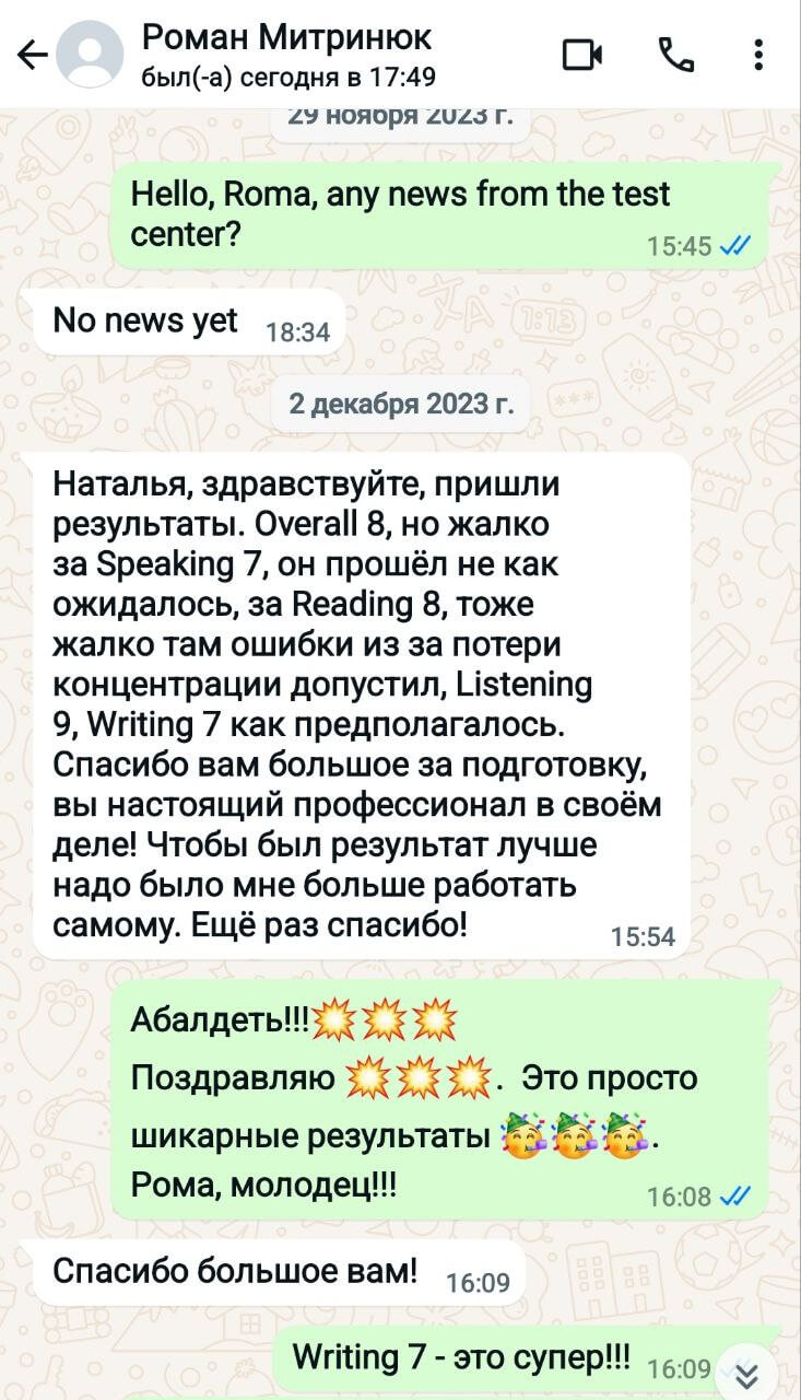 Наталья, добрый день! Результаты получила: Writing 7.5, Speaking 7.5 за месяц подготовки! Хочу вам выразить большую благодарность за ваш вклад и труд!
