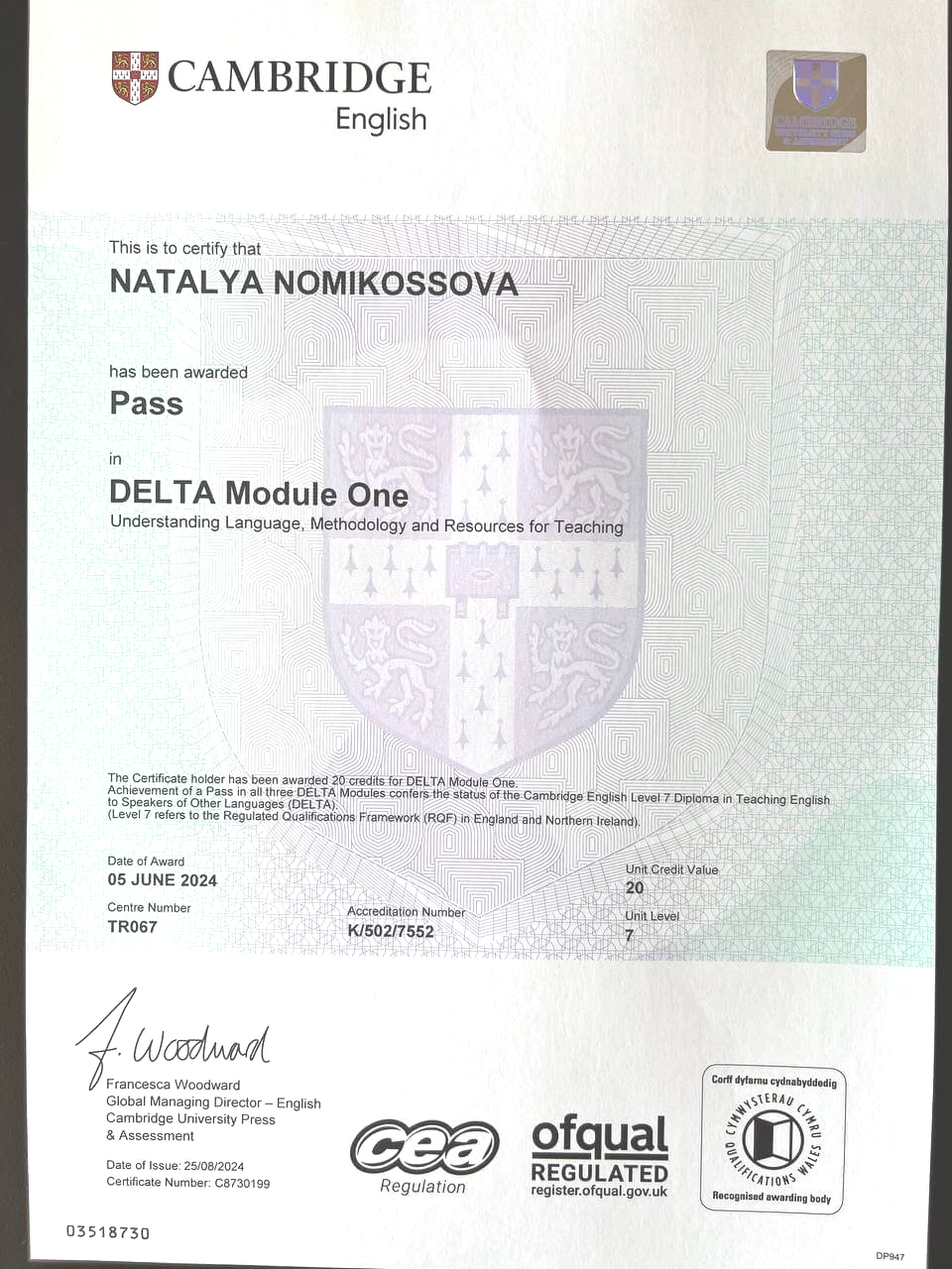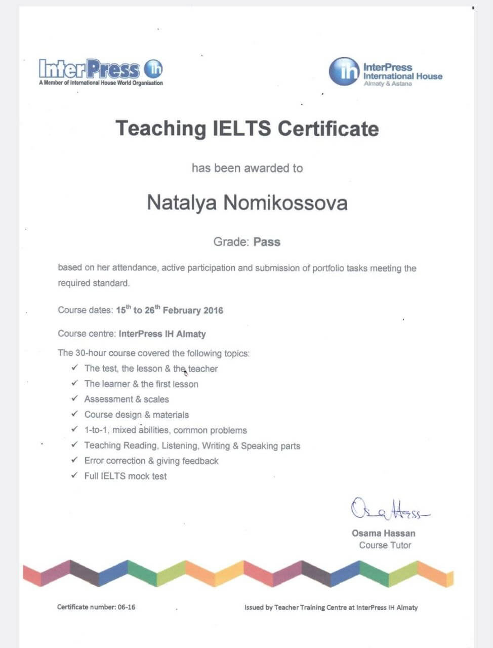 Готовилась с Натальей к IELTS Academic. Наталья хороший преподаватель, заниматься было комфортно, особенно хорошо натренировала письменную часть. Благодаря ее рекомендациям и структурированному подходу смогла успешно подготовиться к двум наиболее сложным частям экзамена Writing и Speaking и сдать его на Band 8.
